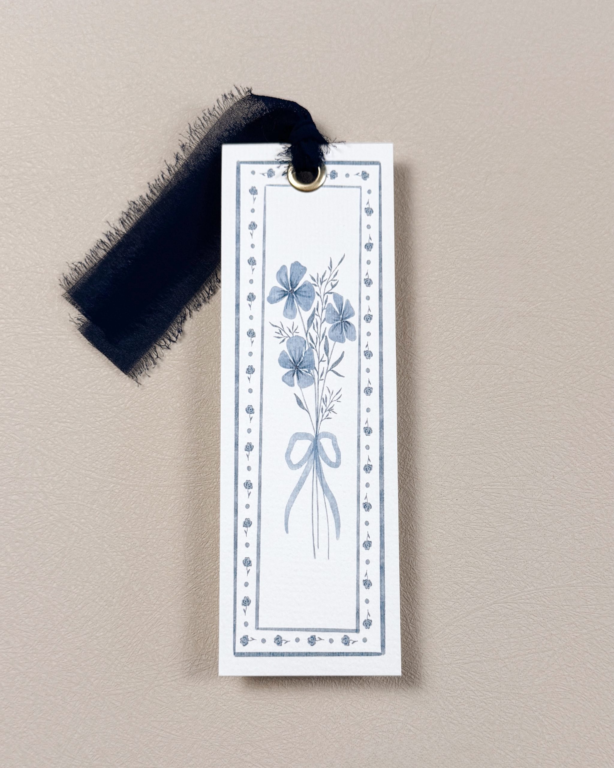 This design features a hand-drawn bouquet of blue flowers in a harmonious array of soft and deep shades, tied with a delicate bow and framed by a coordinating blue floral border. Inspired by the timeless elegance of blue and white china tea cups and accented with a hand-tied navy ribbon, it transforms a simple pause in reading into a moment of beauty and reflection.