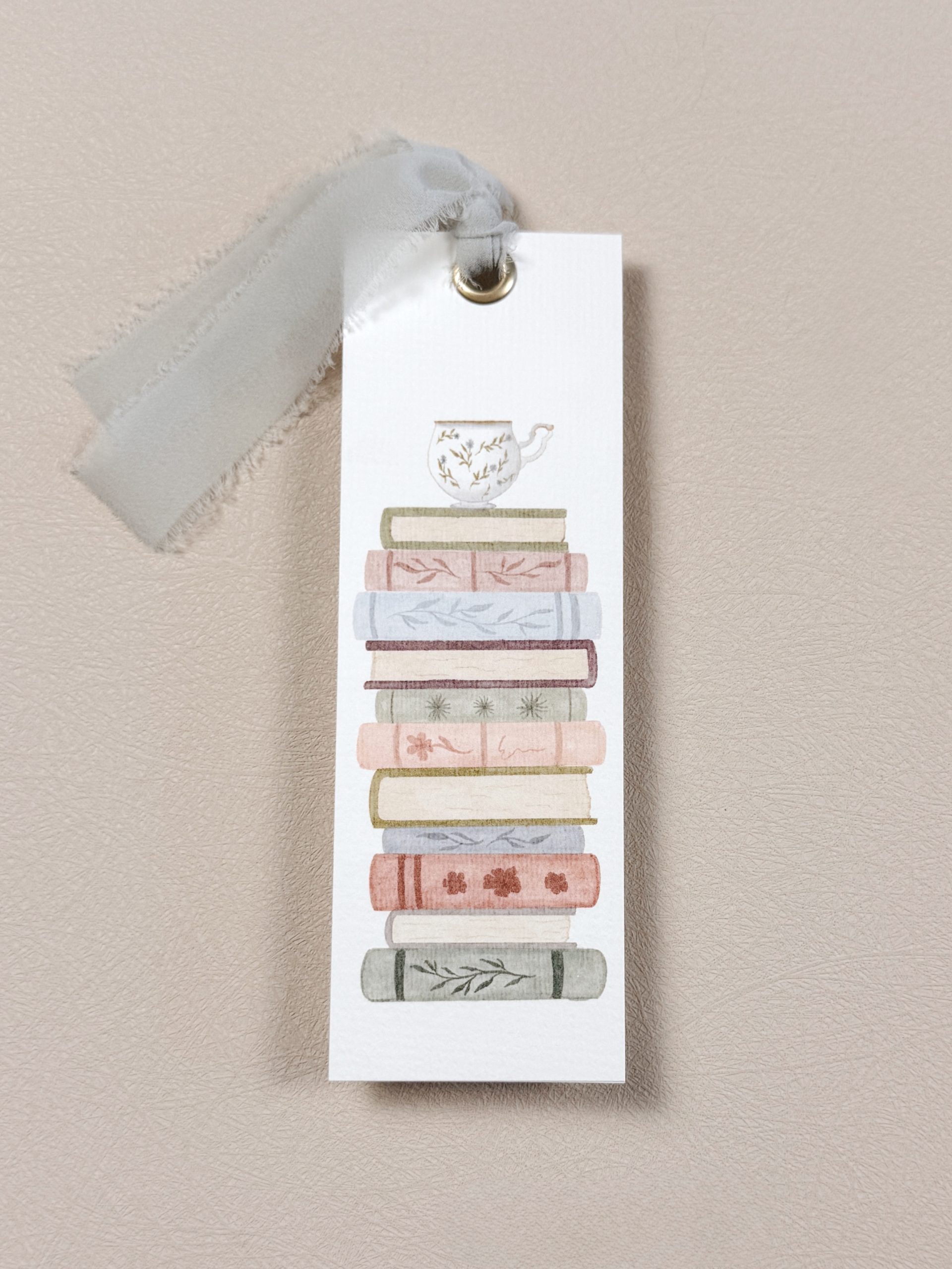 This design features a stack of pastel-colored books crowned with a delicate china tea cup, accented by a hand-tied sage silk ribbon. Thoughtfully created to capture the gentle charm of quiet reading and the simple pleasure of delicate details, it transforms a pause in your day into a moment of beauty and reflection.
