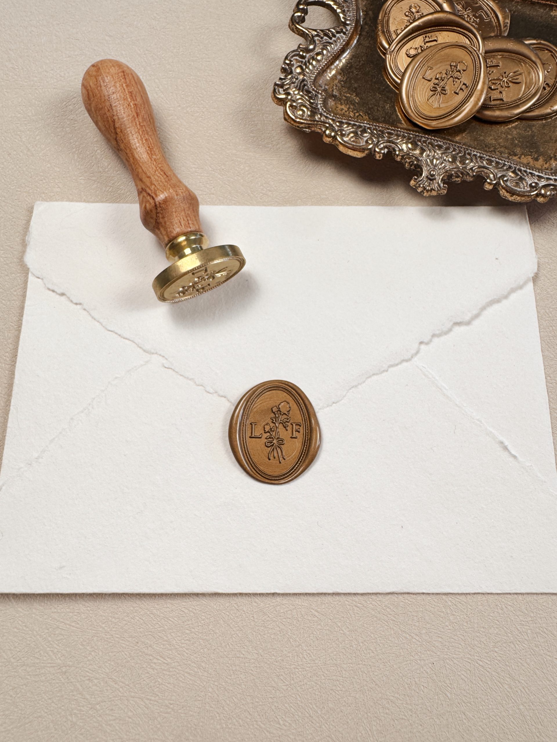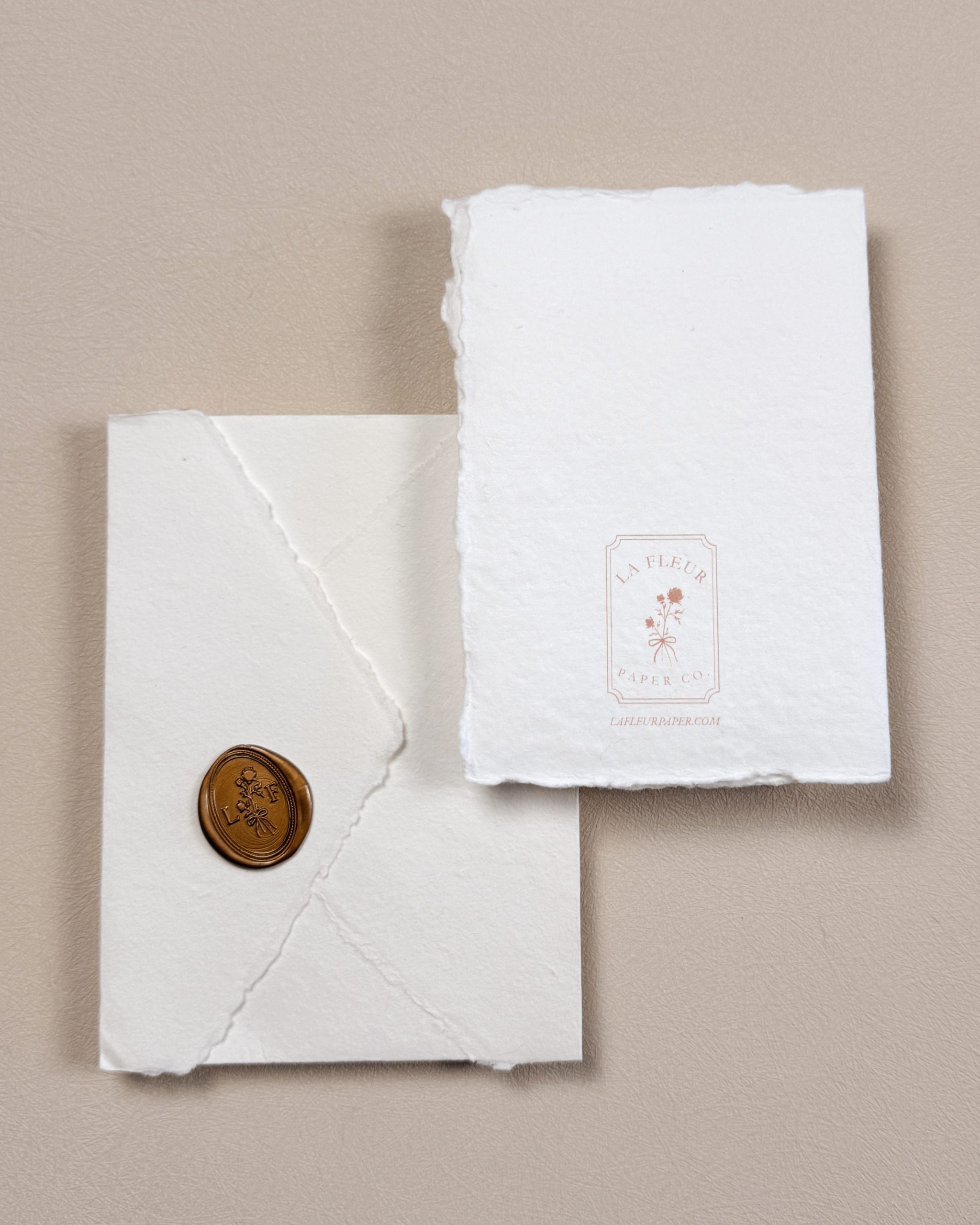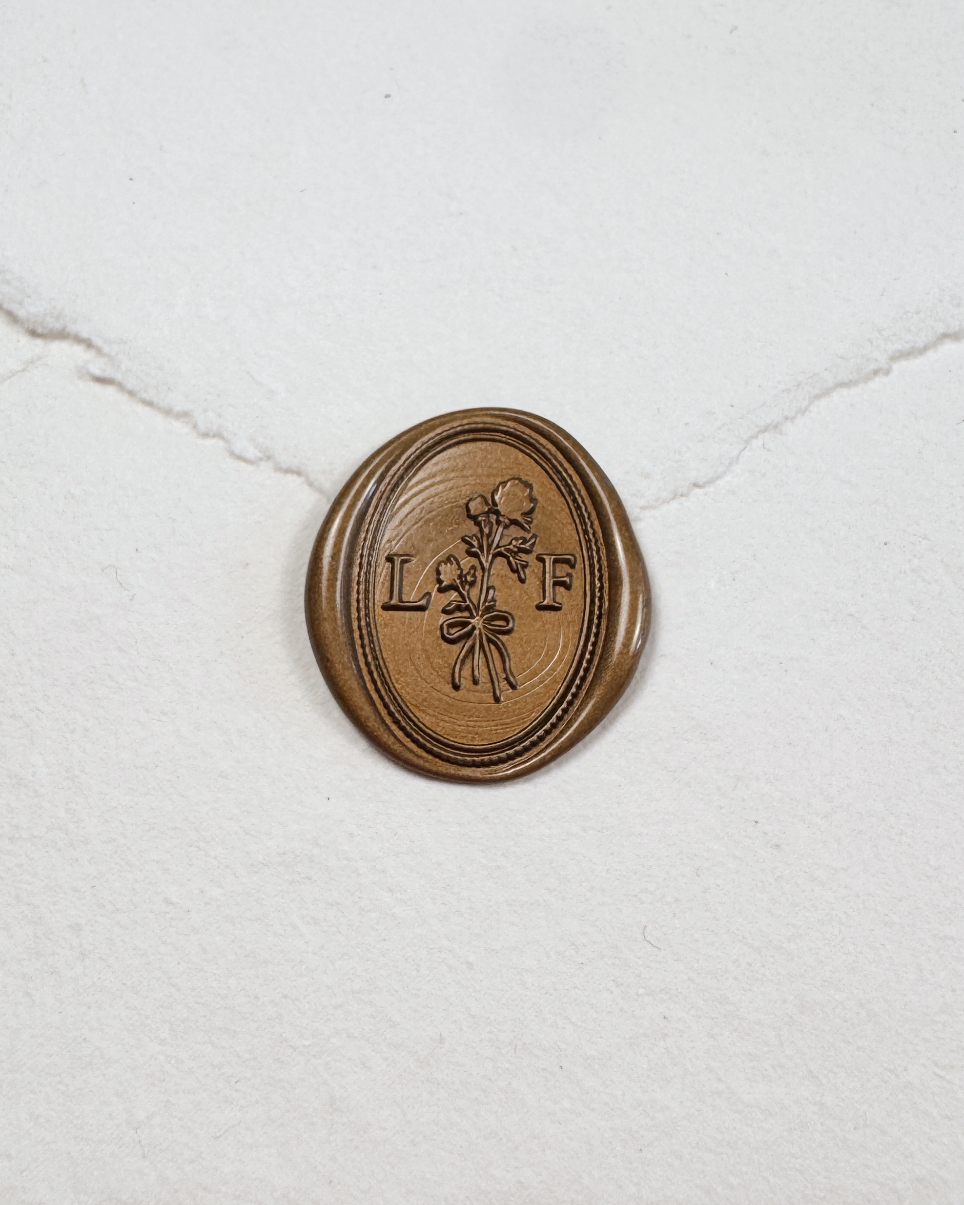 Closure: Gold La Fleur Paper Company branded wax seal adhesive