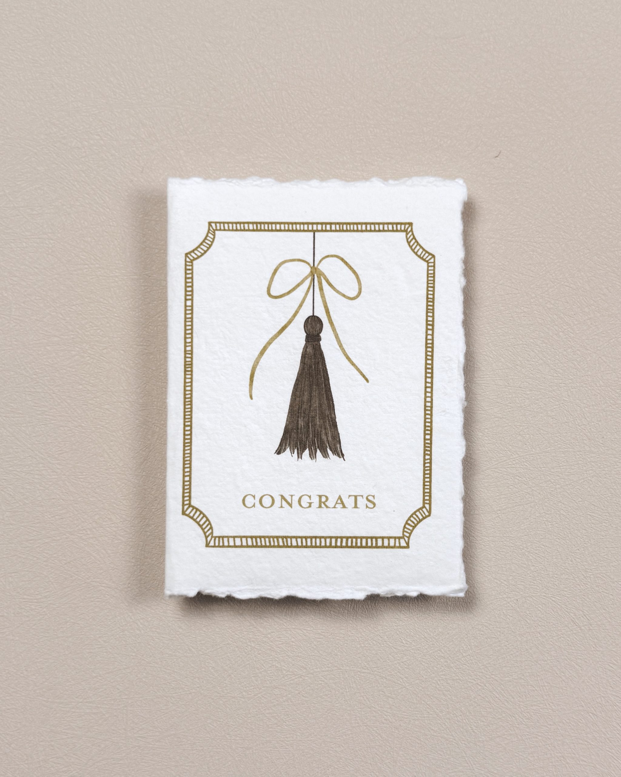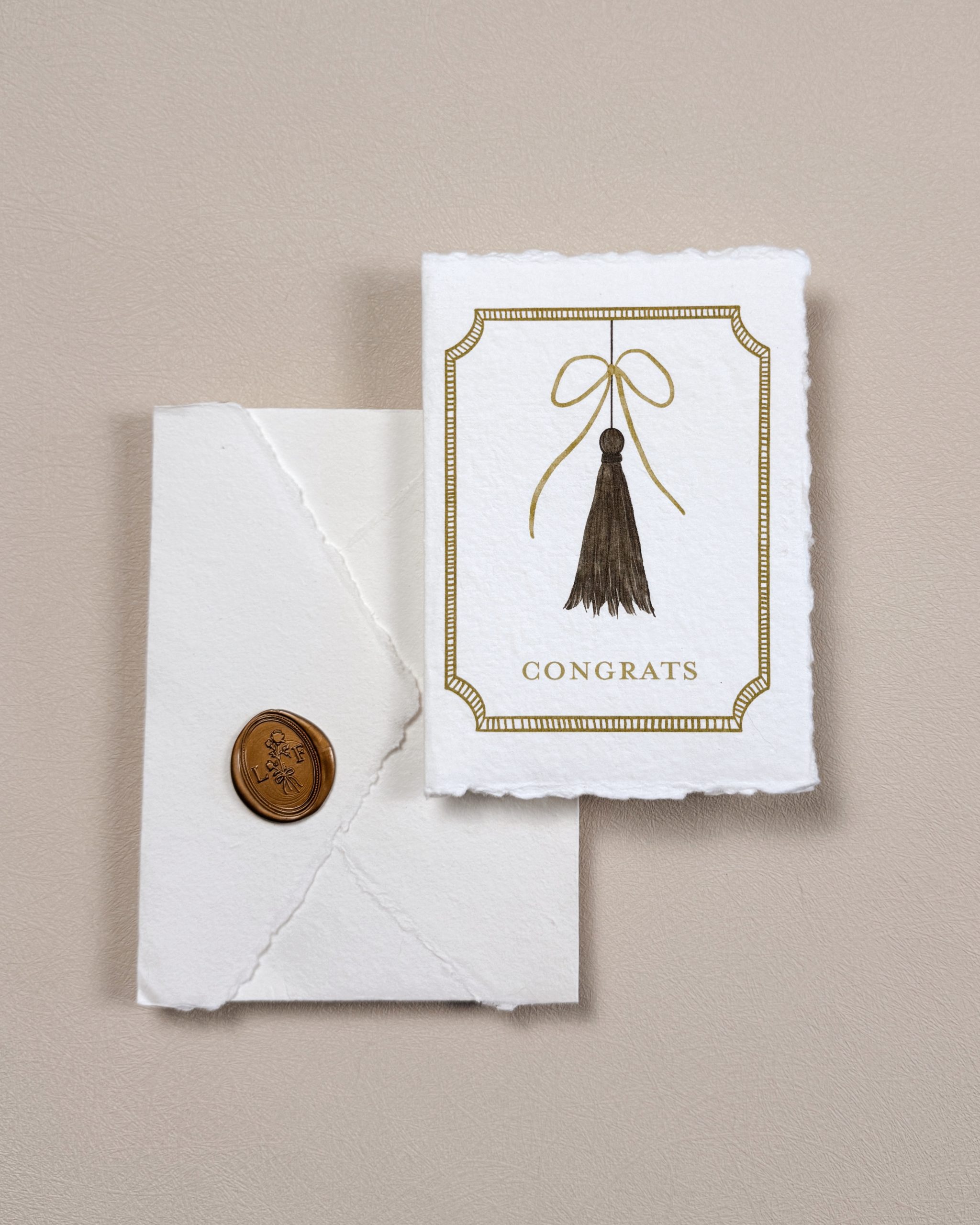 This graduation card features a tassel accented with an olive green bow, set within a coordinating olive green frame, celebrating achievement with elegance. Printed on handmade cotton paper with deckled edges and paired with a matching envelope and wax seal, it’s a keepsake for sharing heartfelt congratulations.