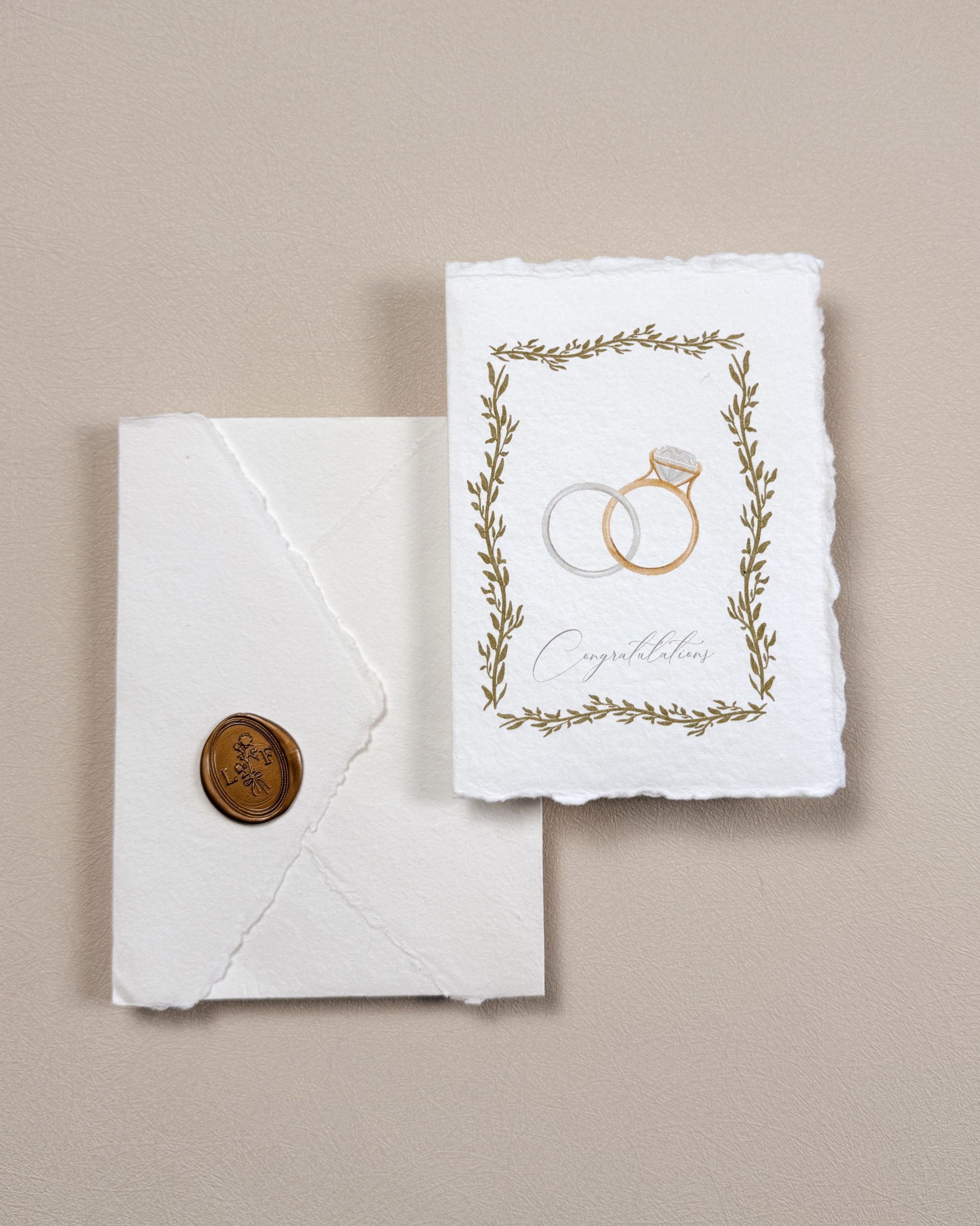 Printed on white, handmade cotton paper with softly torn deckled edges, this card offers a graceful, heirloom-quality finish. All illustrations are digitally printed in-house to preserve every fine line and delicate detail. It is paired with a matching white handmade cotton envelope featuring a refined euro flap and finished with our signature gold wax seal adhesive, each one handmade on-site. Created with care from start to finish, this card is a keepsake meant to be treasured.