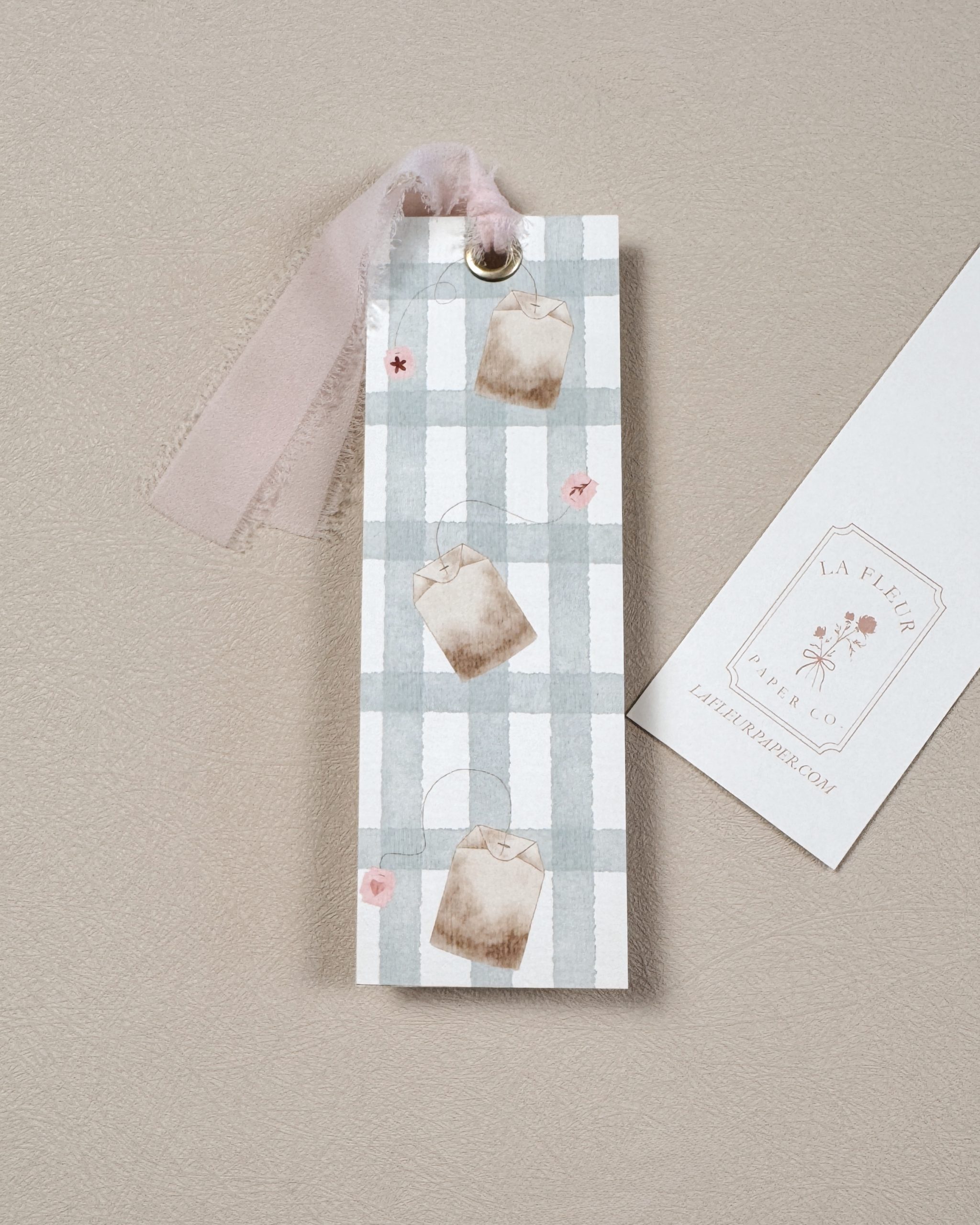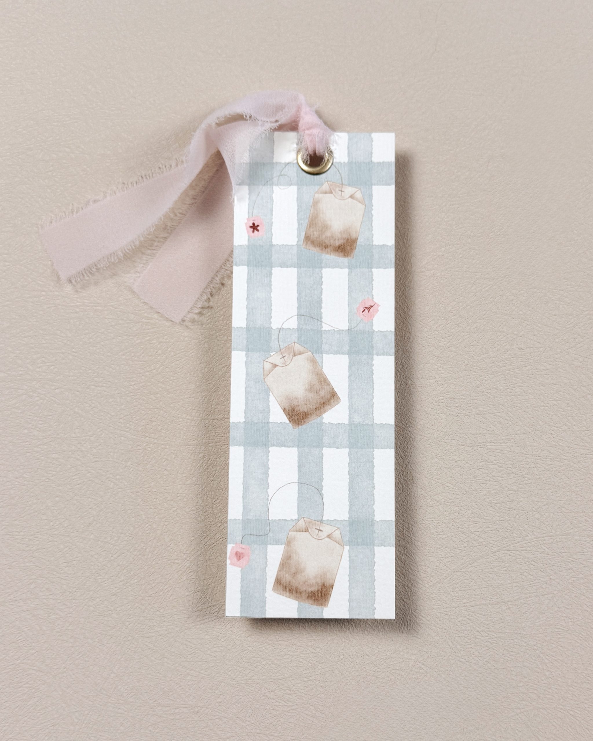 This design features delicate hand-drawn tea bags set against a soft light blue gingham background, accented by a hand-tied blush ribbon, evoking the warmth of slow mornings and quiet cups shared. Thoughtfully created to capture a sense of comfort and gentle nostalgia, it transforms a simple pause in reading into a moment of beauty and reflection.