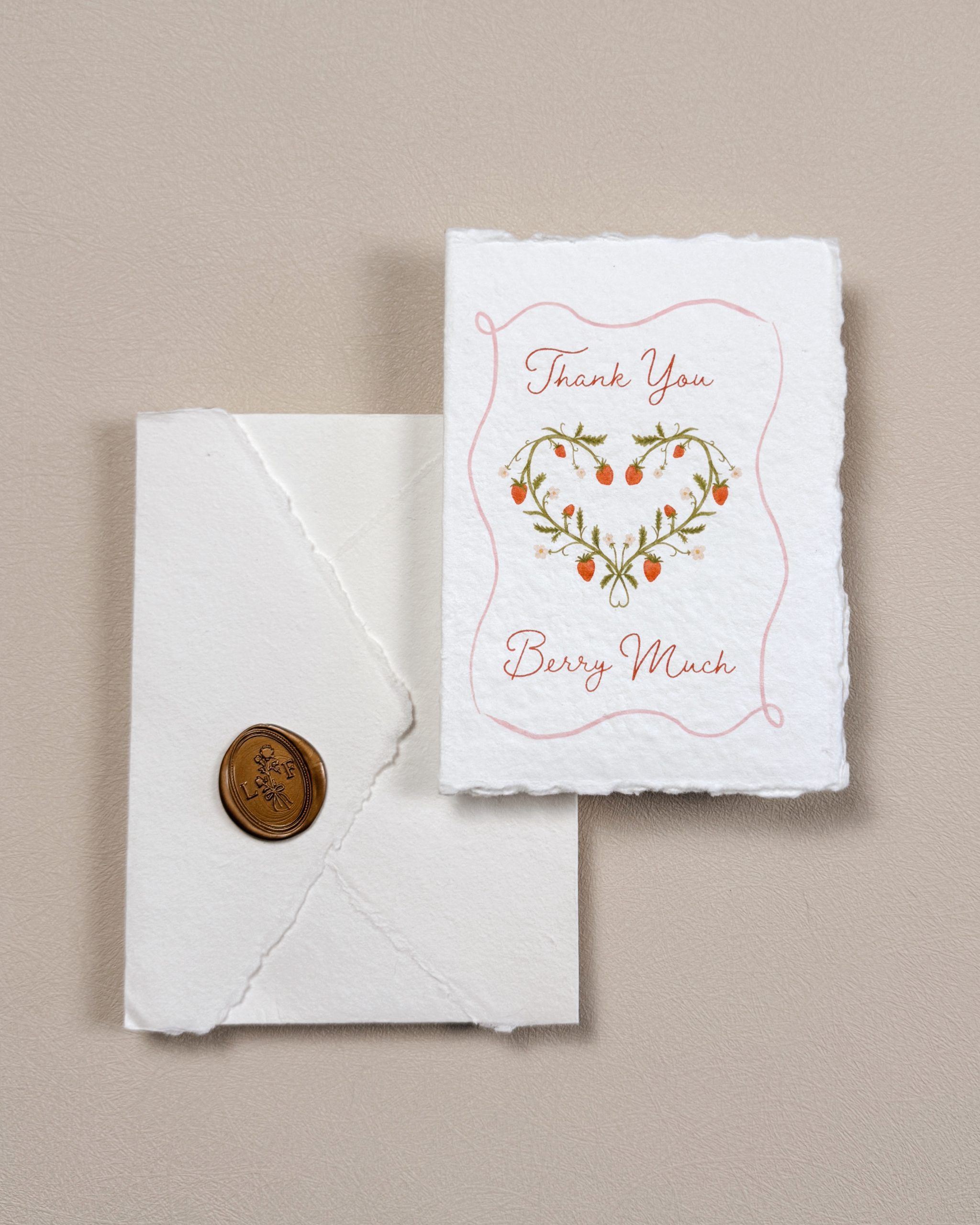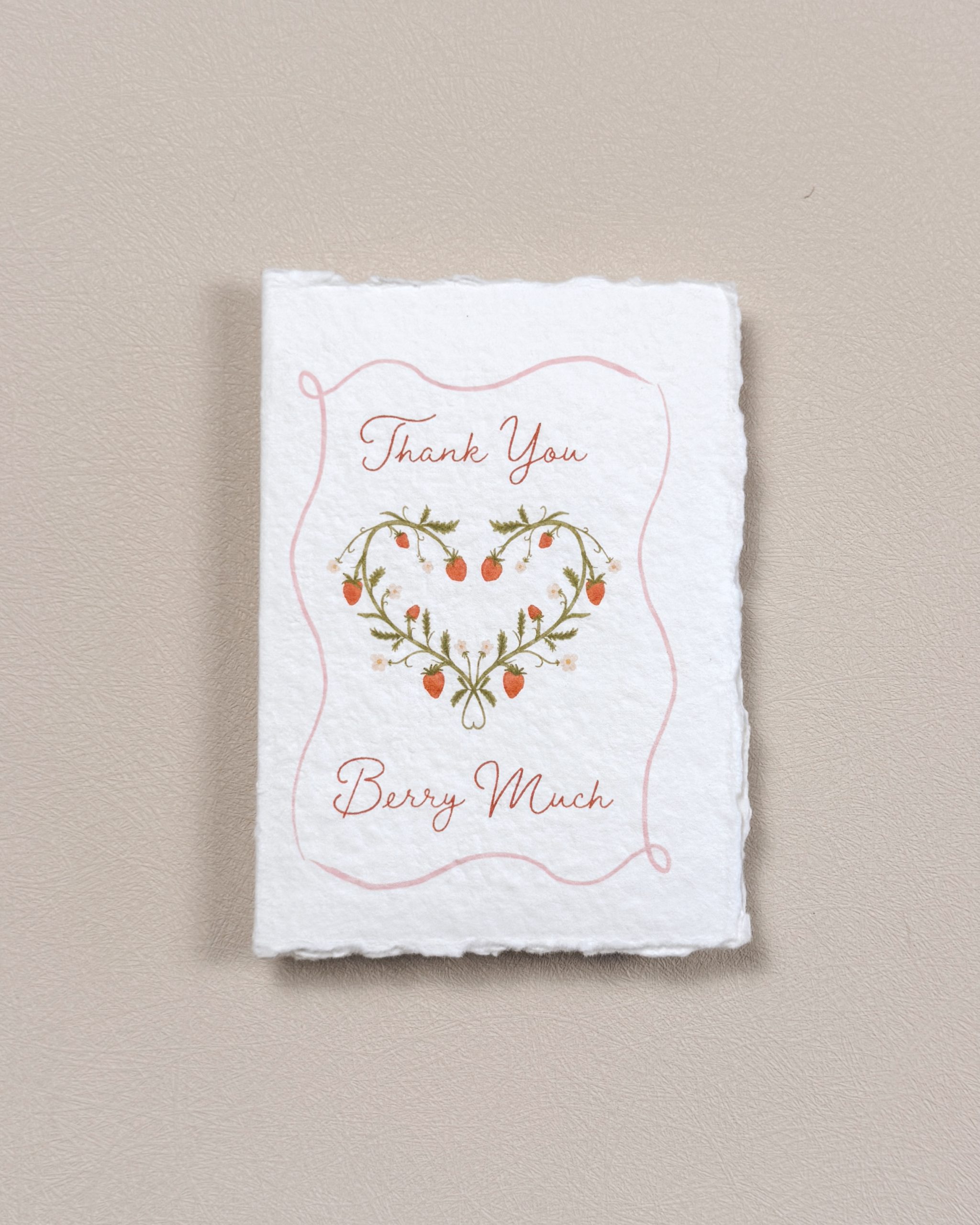 This thank you card features a heart-shaped cluster of ripe berries and delicate blossoms, celebrating gratitude with a playful yet graceful spirit. Thoughtfully left uninscribed within, it invites your own heartfelt words, allowing the message to be truly personal and unique.