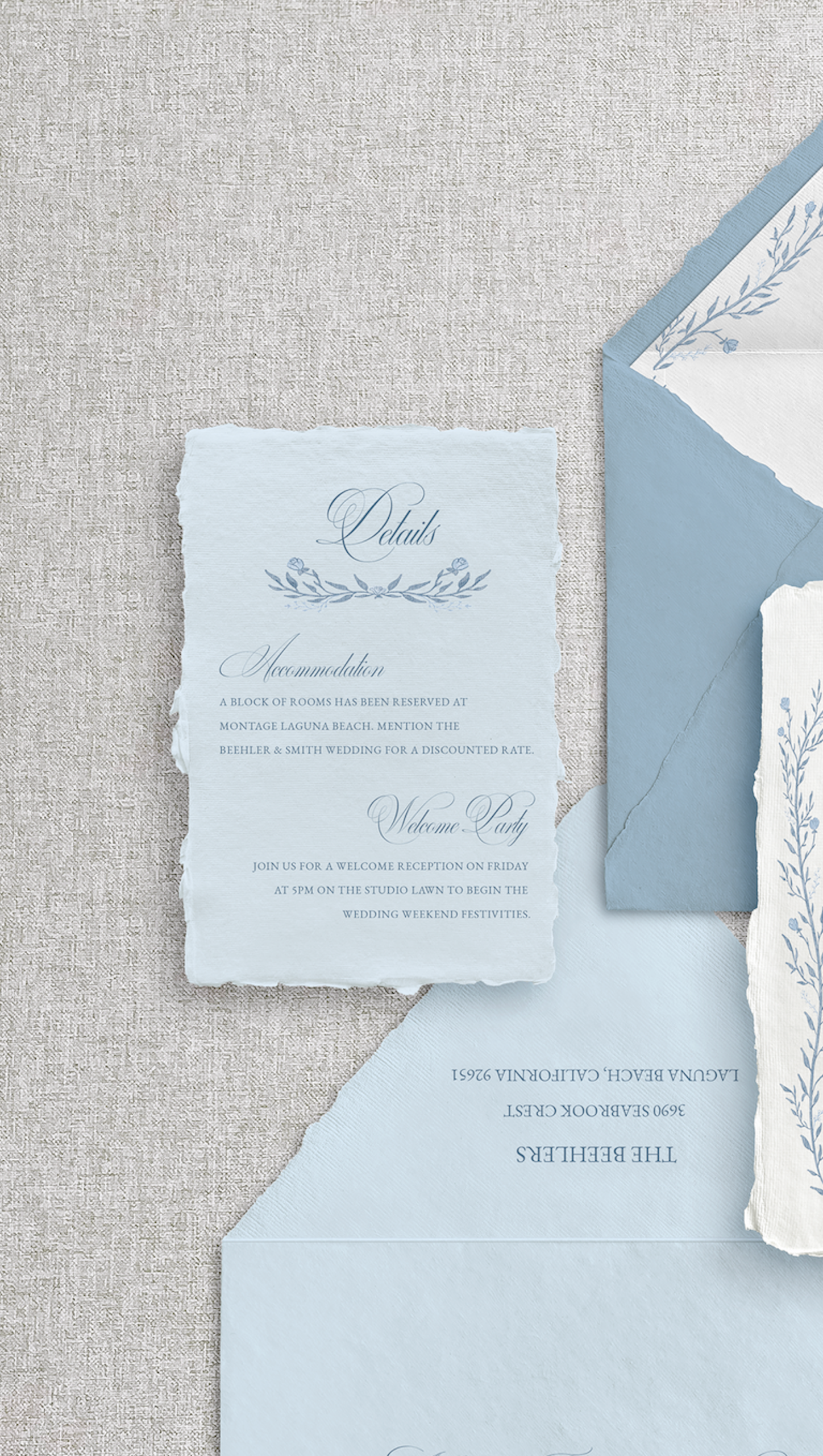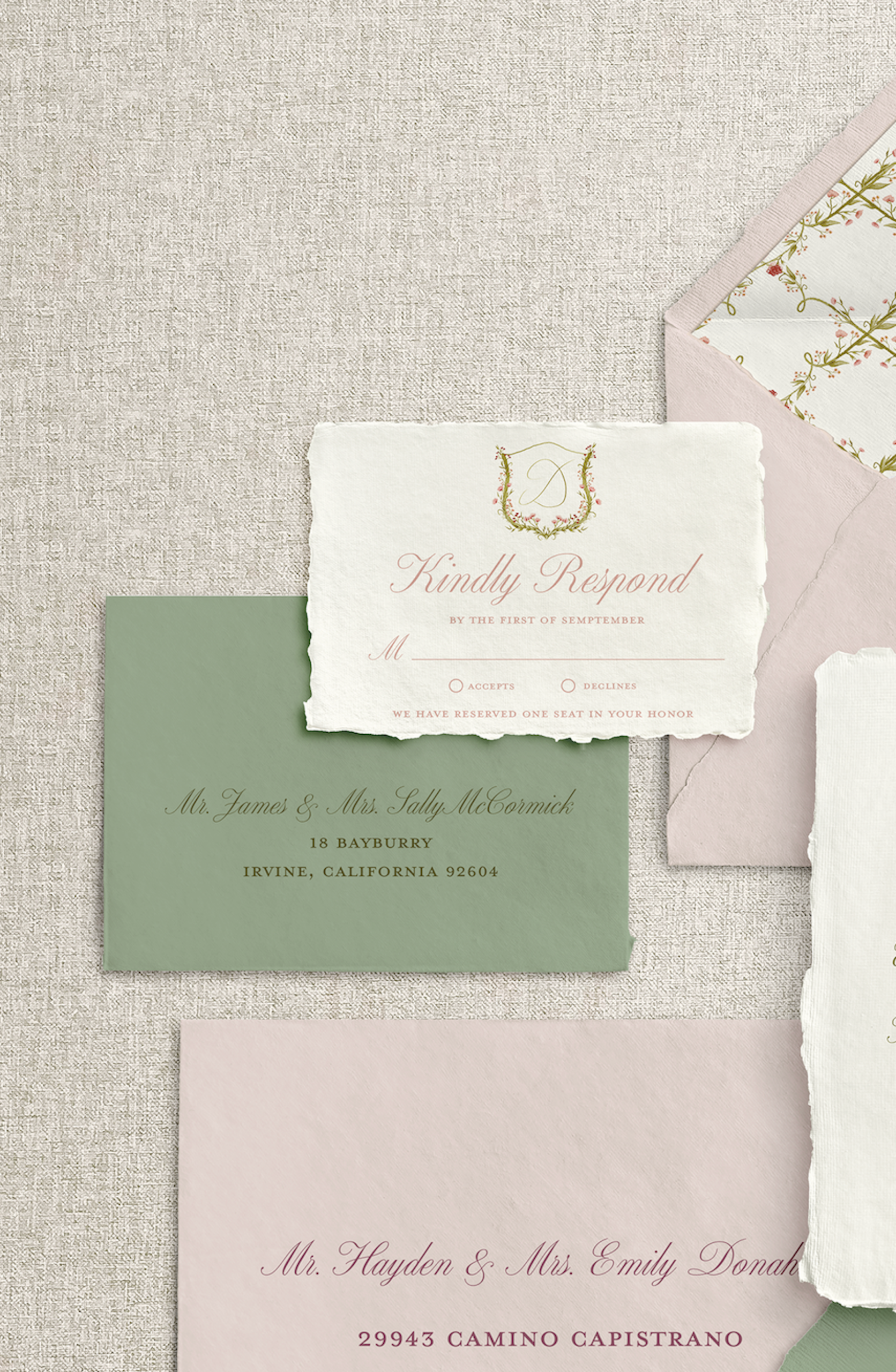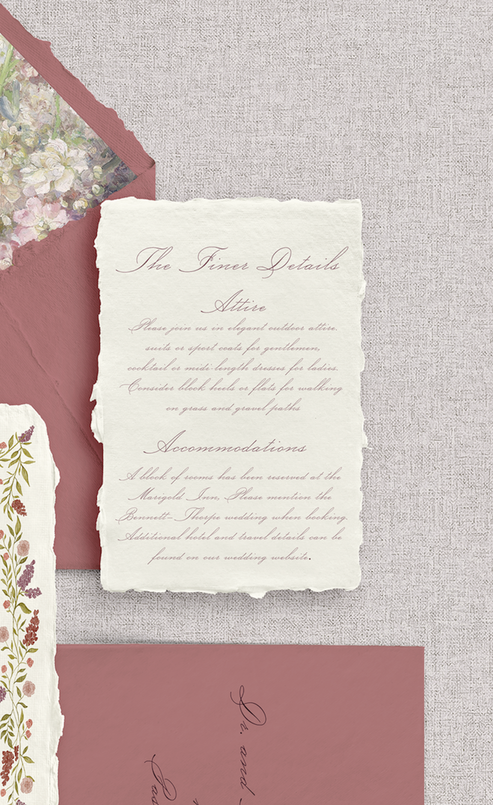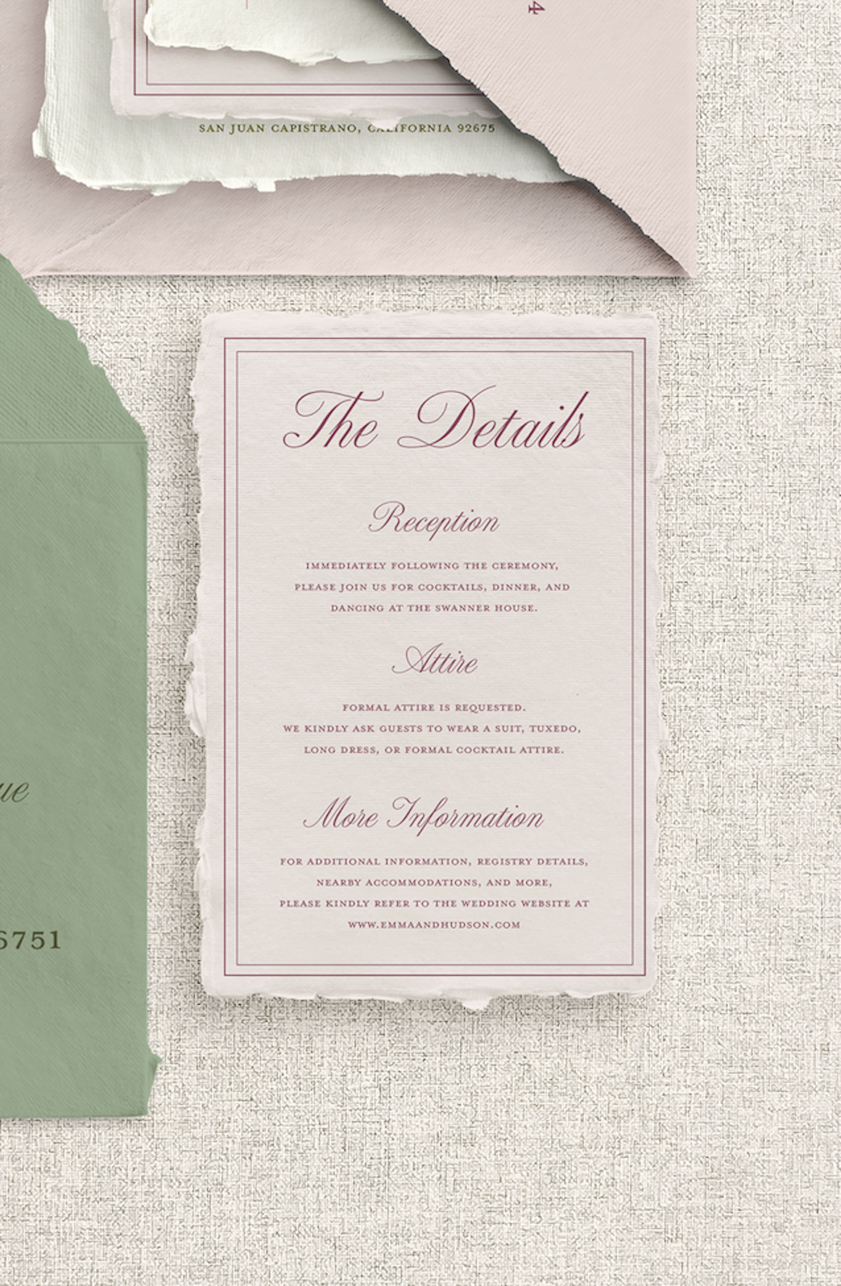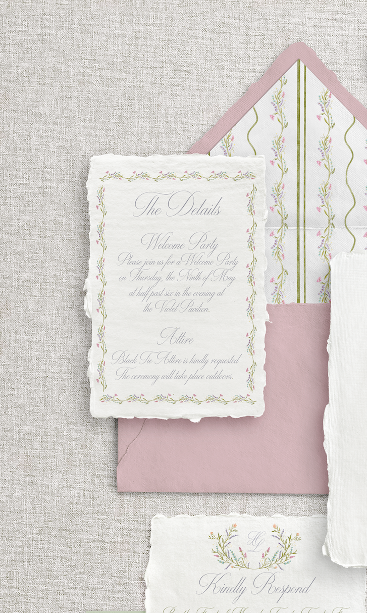 Find the perfect foundation for your suite with our signature handmade cotton paper or other curated luxurious options. Choose the texture and shade that enhances your design and elevates the look and feel of each piece.