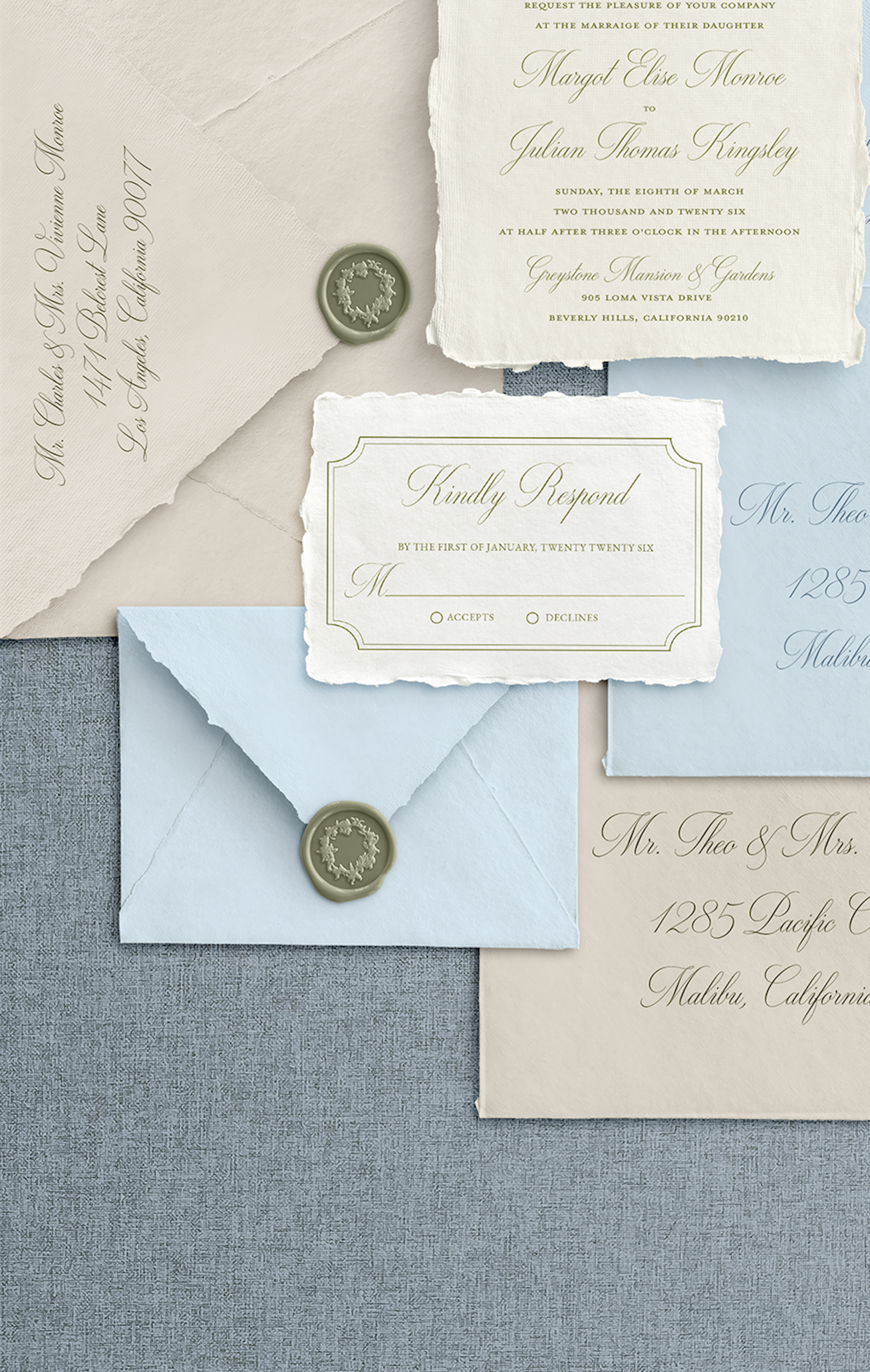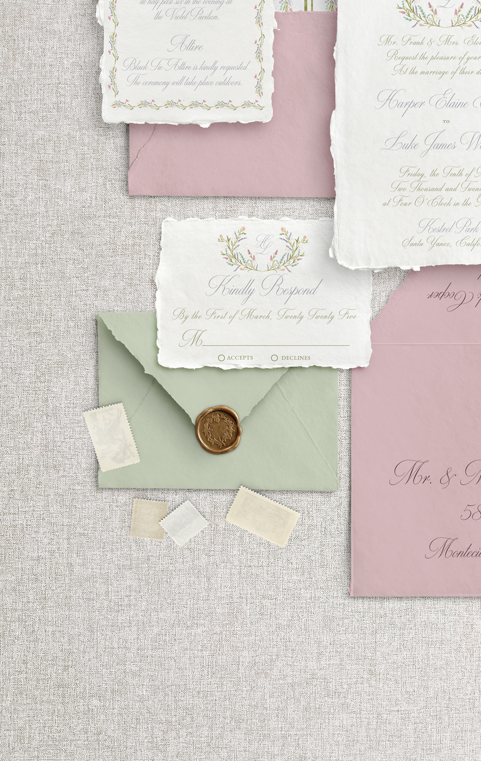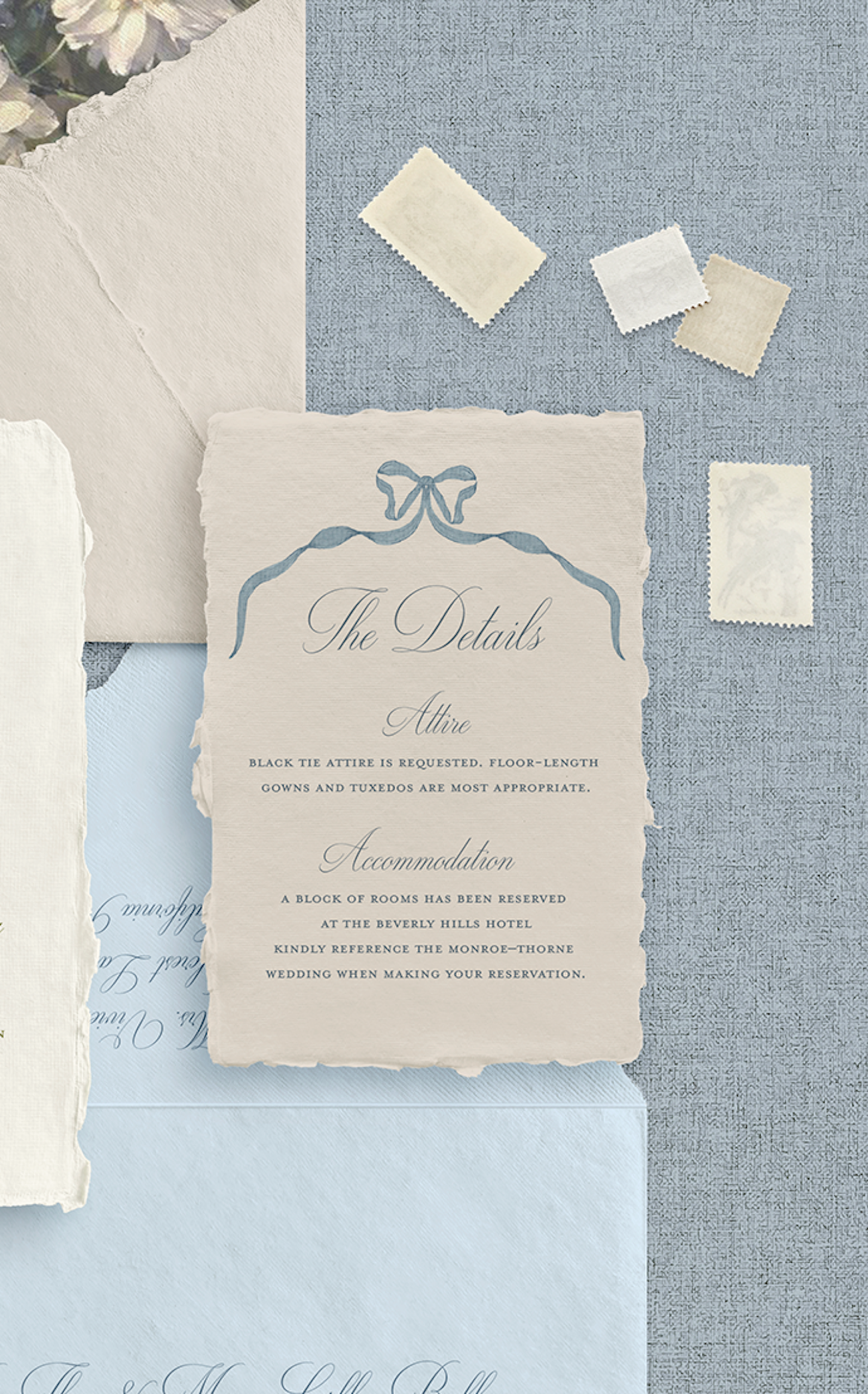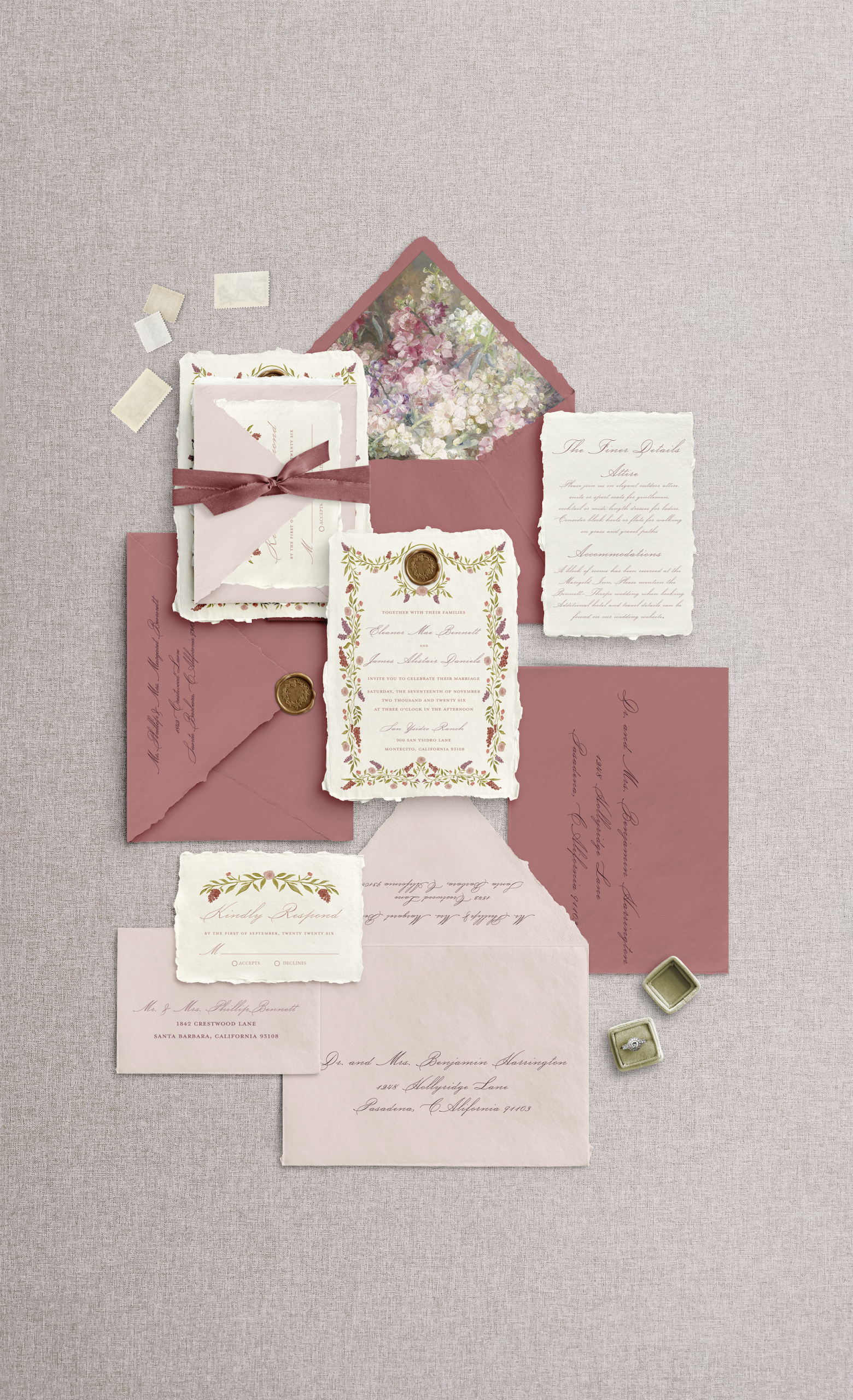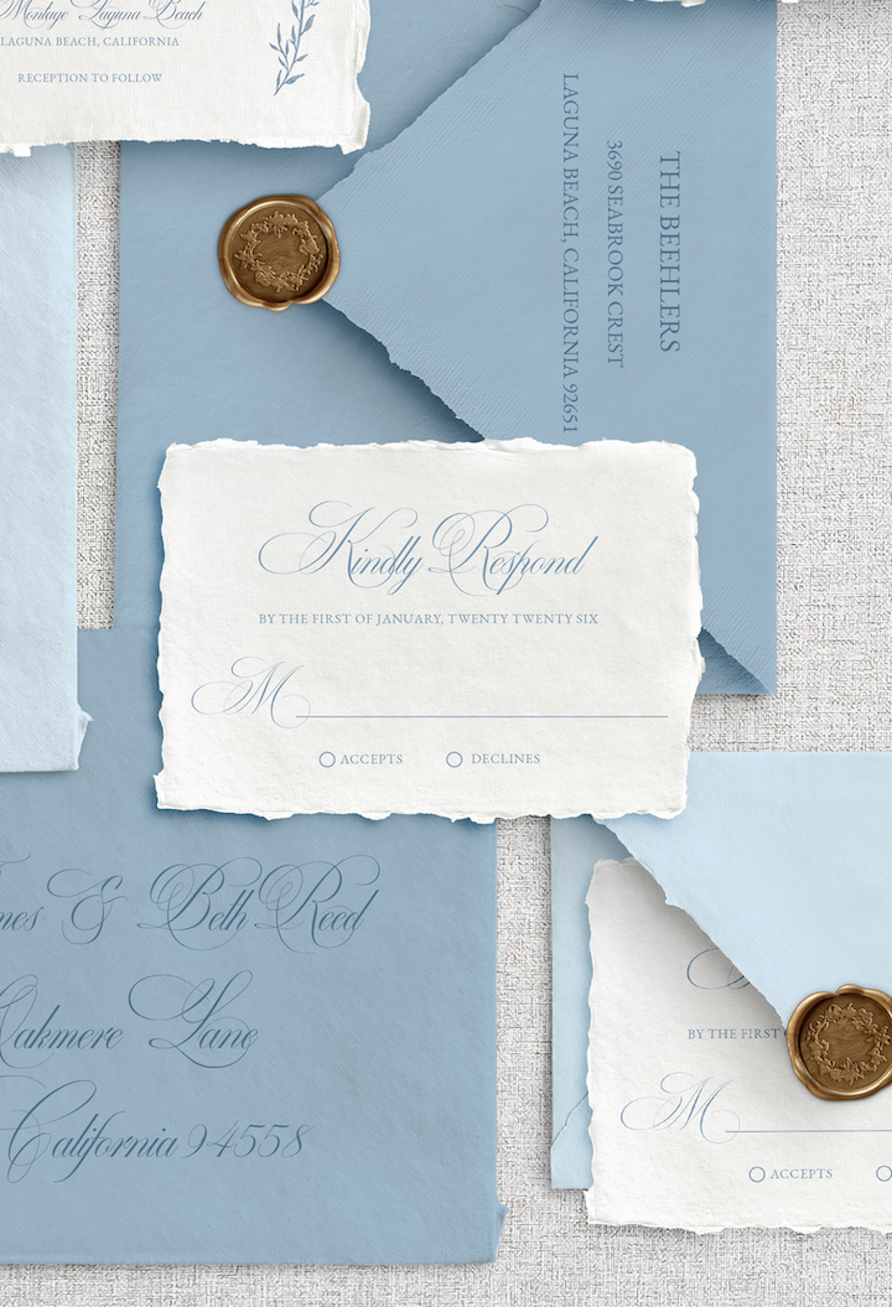 Add the details that make your suite uniquely yours. From ribbons to wax seals, vellum wraps, or other embellishments, these final touches bring depth, texture, and personality to your collection.
